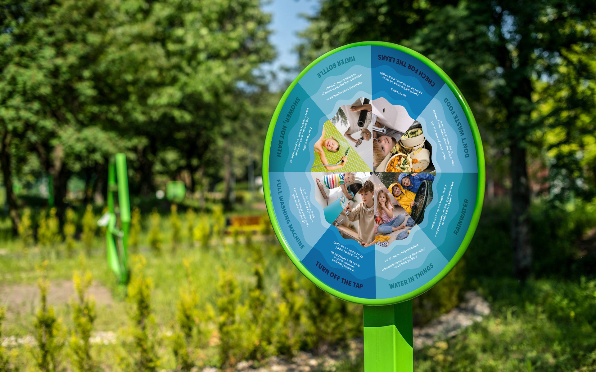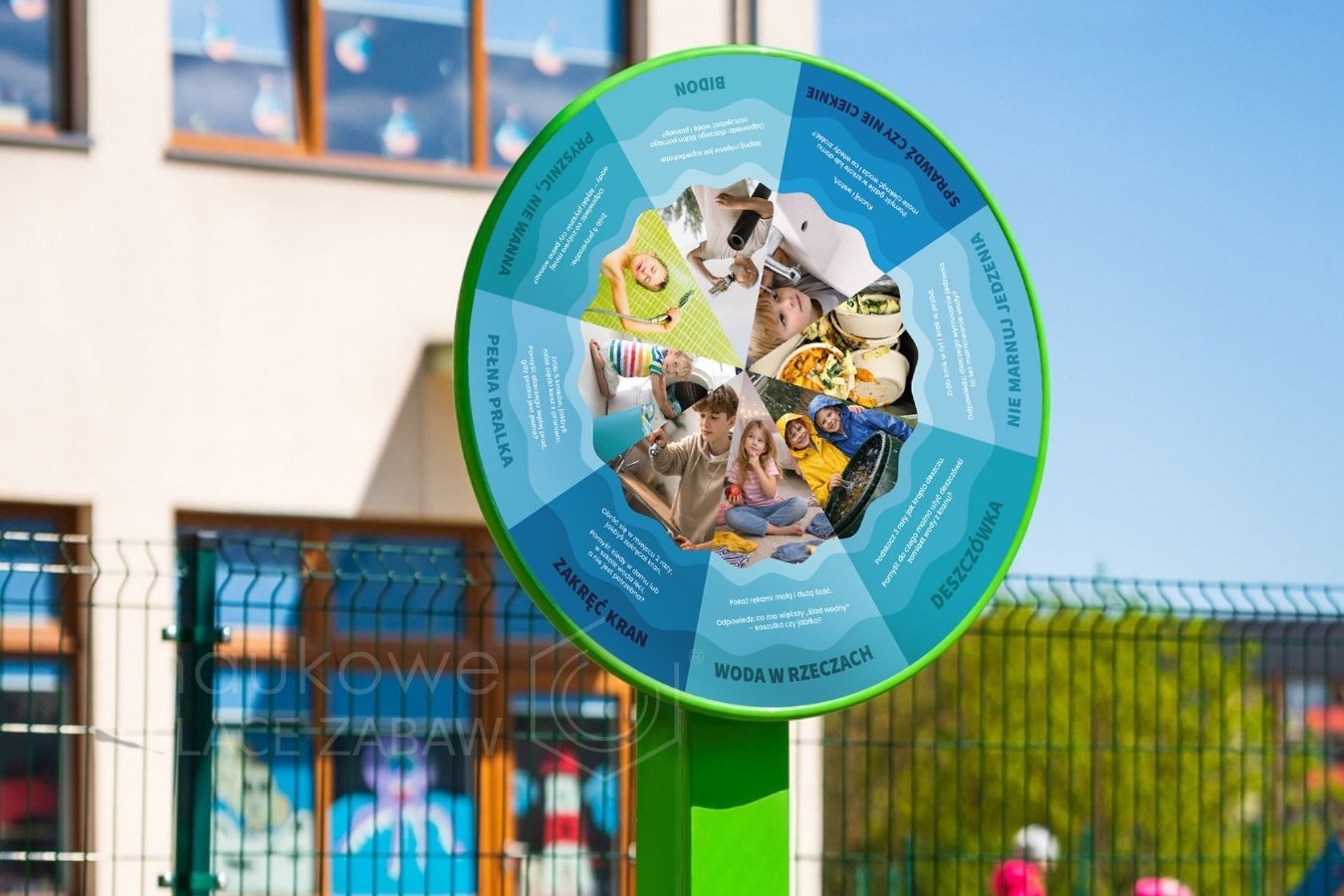 Możesz dokupić wymienne magnetyczne tarcze i zmienić Koło edukacyjne – Oszczędzaj wodę w zupełnie nową grę na placu zabaw lub pomoc terapeutyczną.