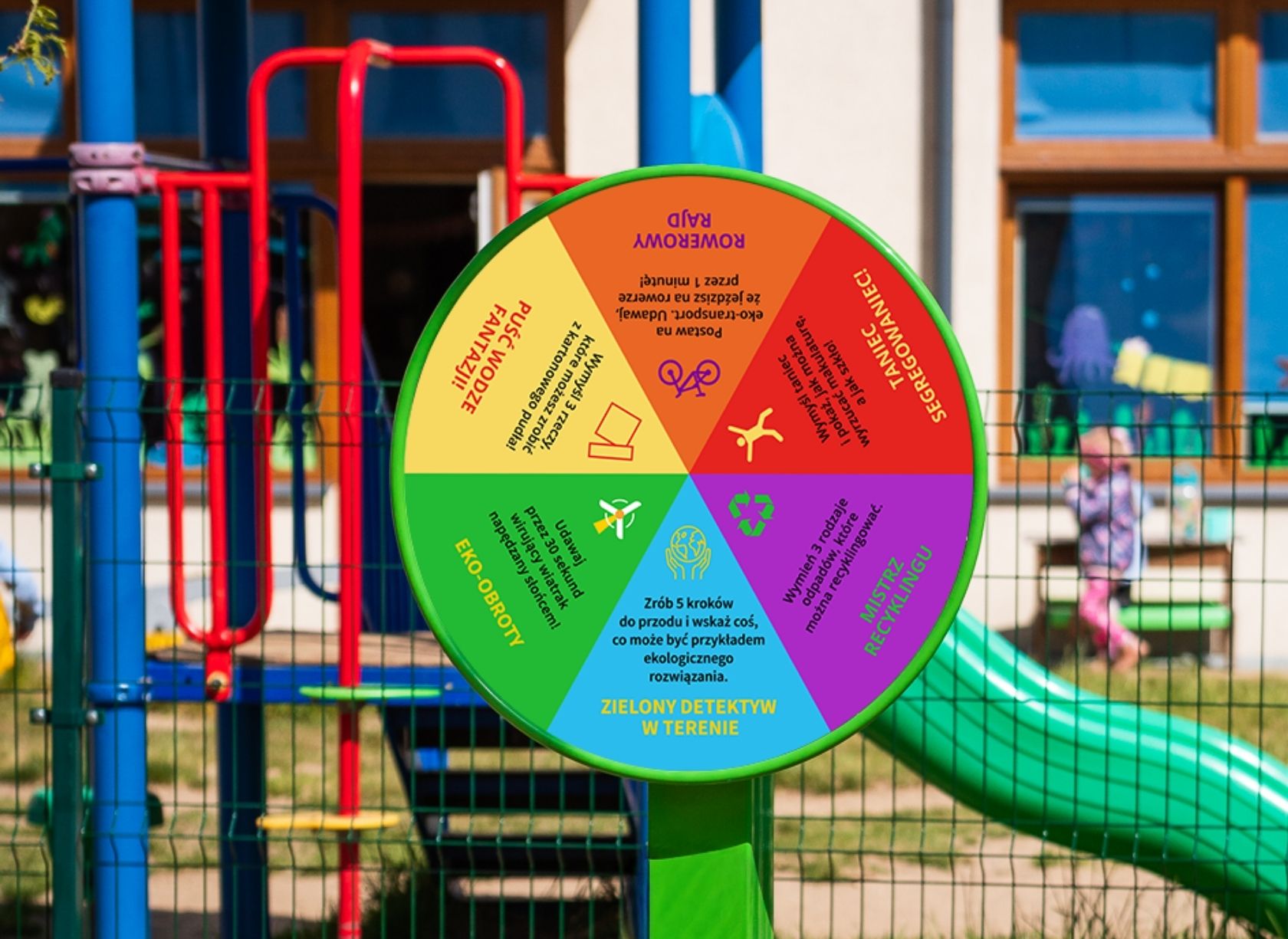 To edukacyjno-ruchowe urządzenie w formie koła losującego zadania, które uczą postaw proekologicznych i zachęcają do działania. Każde zakręcenie kołem to nowe wyzwanie związane z recyklingiem, segregacją odpadów, oszczędzaniem wody czy dbaniem o naturę – połączone z zadaniami ruchowymi.