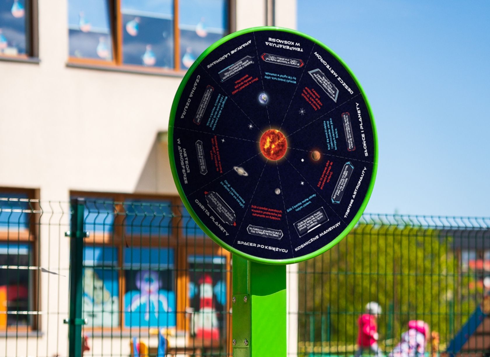 To wyjątkowe urządzenie edukacyjno-ruchowe, w którym każde zakręcenie kołem otwiera przed dziećmi nowe kosmiczne wyzwanie. Po zatrzymaniu tarczy strzałka wskazuje zadanie inspirowane ruchem ciał niebieskich, lotami rakiet lub życiem astronautów.