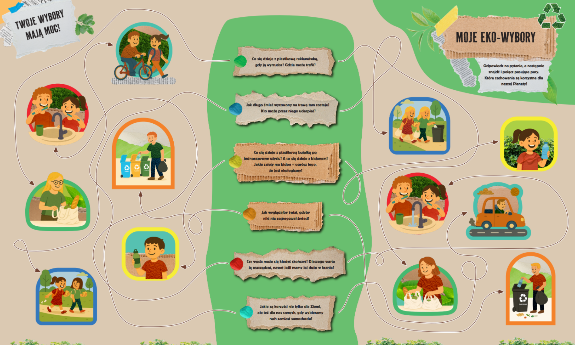 Podczas zabawy dzieci łączą pytania z ilustracjami przedstawiającymi dobre lub złe praktyki. Mogą sprawdzić m.in., czy oszczędzanie wody, segregacja śmieci, ograniczenie plastiku czy wybór roweru zamiast samochodu to właściwy wybór.