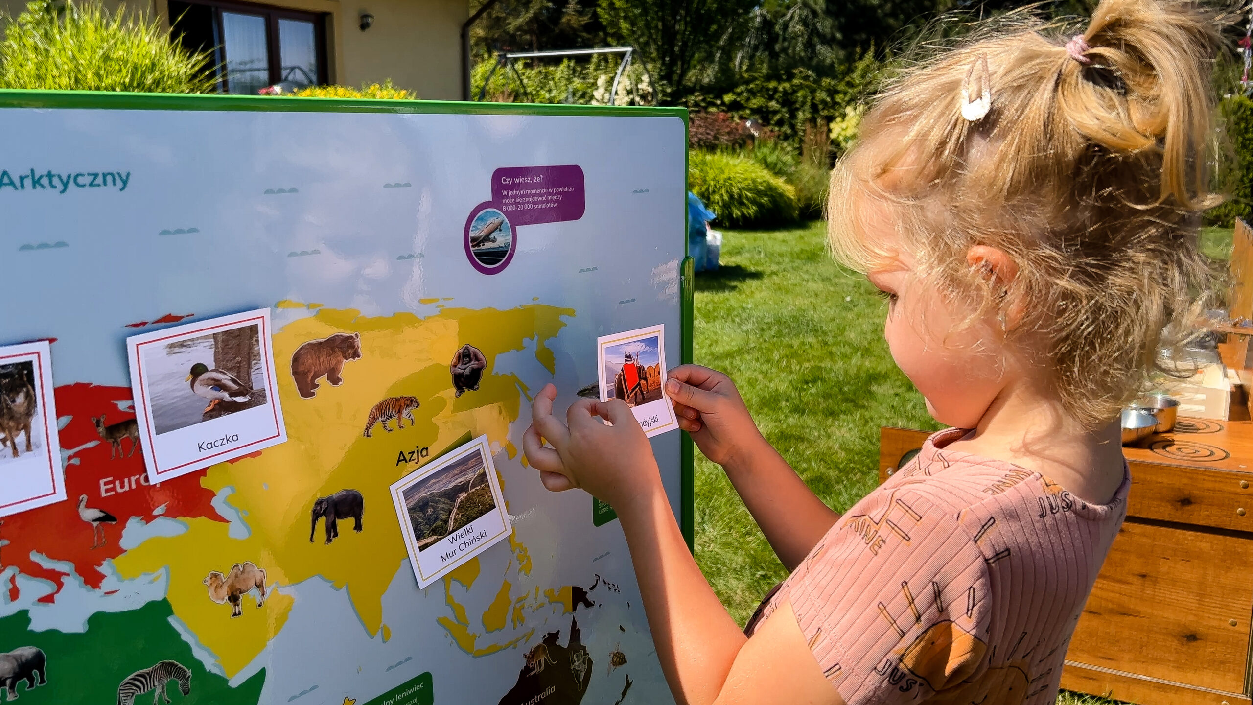 Wielofunkcyjny plac zabaw? Teraz to możliwe! Tablica edukacyjna pozwala na setki zabaw i gier za pomocą tematycznych magnesów. Odnajdź ciekawostki ukryte na tablicy. Zobacz, gdzie występują różne zwierzęta, dowiedz się jak nazywają się oceany i kontynenty oraz jak wygląda róża wiatrów!