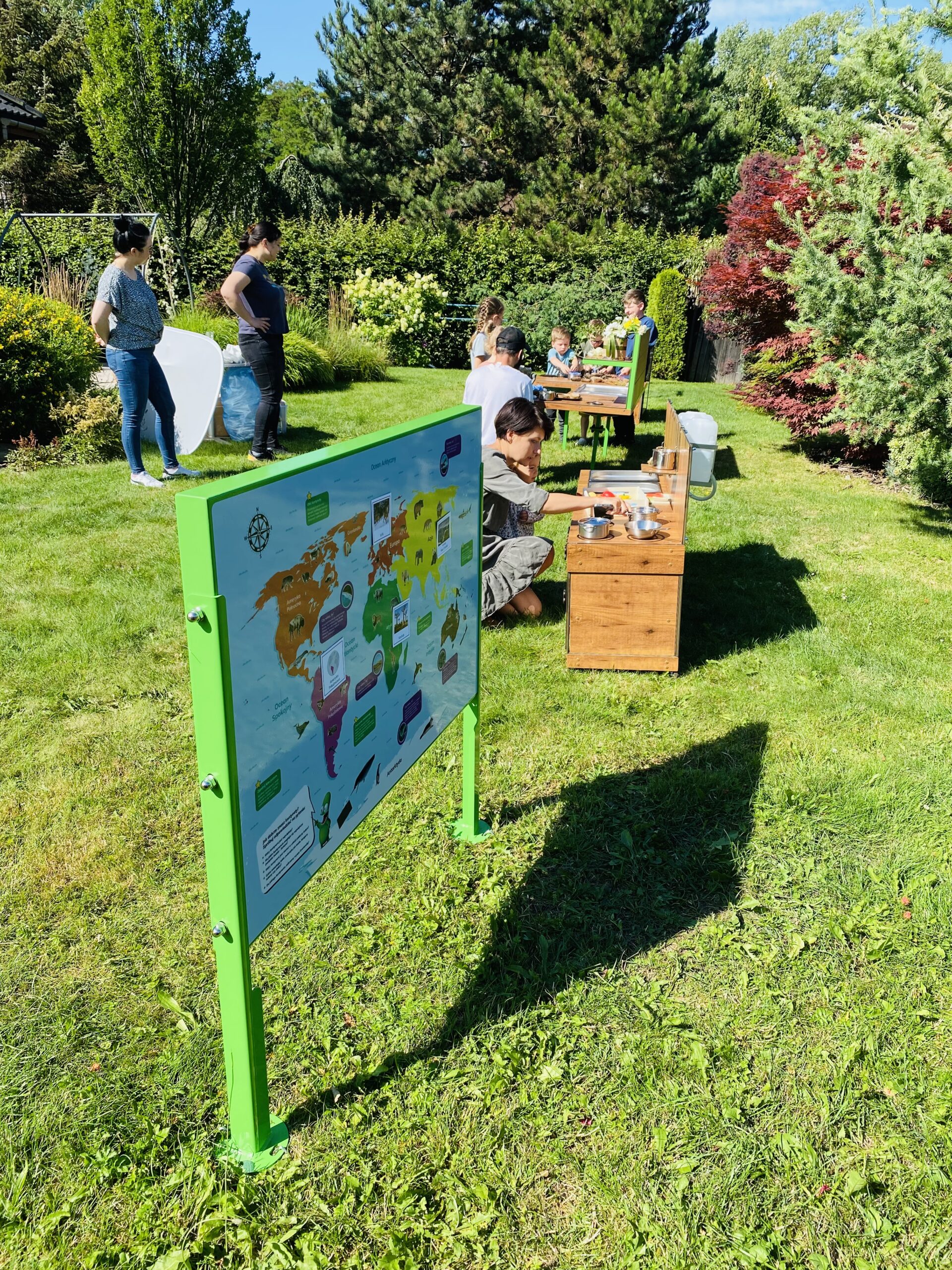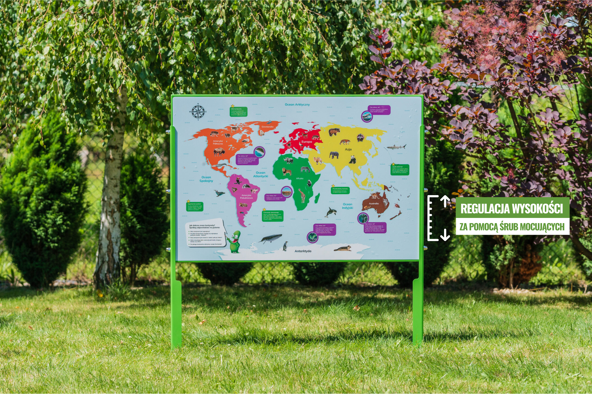 “Kontynenty” to całoroczna tablica do zabaw w ogrodzie przedszkolnym lub szkolnym. Wspiera naukę podstaw geografii, przyrody czy ekologii. Dzięki niej, dzieci z łatwością uczą się wiedzy o kontynentach, które zostały oznaczone różnymi kolorami wg zaleceń metody Marii Montessori. Zwierzęta zostały przedstawione w formie rzeczywistych zdjęć i są umieszczone w swoich środowiskach naturalnych. Na tablicy znajdują się również propozycje gier i zabaw outdoorowych oraz seria pytań dla sprawdzenia swojej wiedzy o świecie.