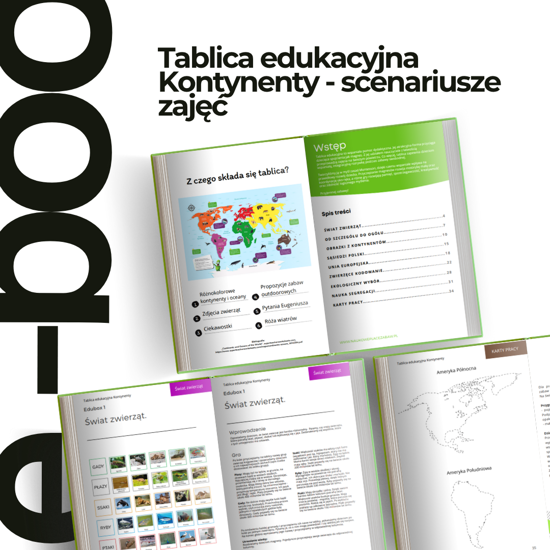 Ten wyjątkowy e-book to skarbnica pomysłów na zajęcia, gry edukacyjne i zabawy sensoryczne z wykorzystaniem tablicy edukacyjnej „Kontynenty”. Scenariusze zostały opracowane zgodnie z zasadami pedagogiki Montessori – rozwijają nie tylko wiedzę o świecie, ale i zmysły, motorykę małą, kreatywność oraz umiejętności społeczne dzieci.